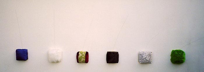 Installation aus 6 textilen Objekten mit Stahlsensor, Maße: 6 x 0,25m x 0,25m